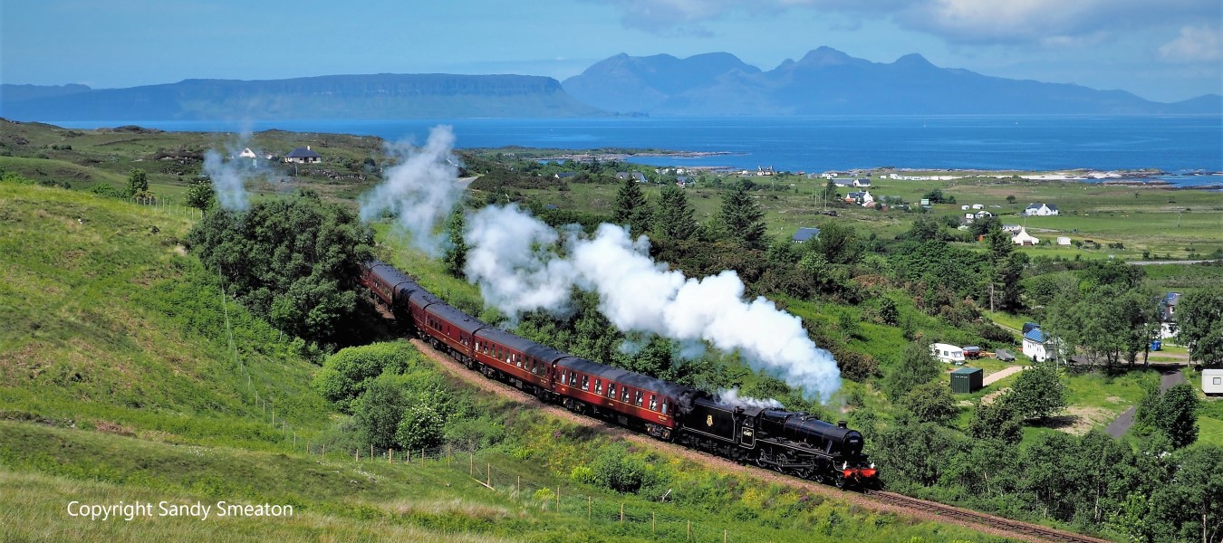 14.10 from Mallaig behind 44871 crossing the 12.50 from Fort William at Arisaig, May 2023