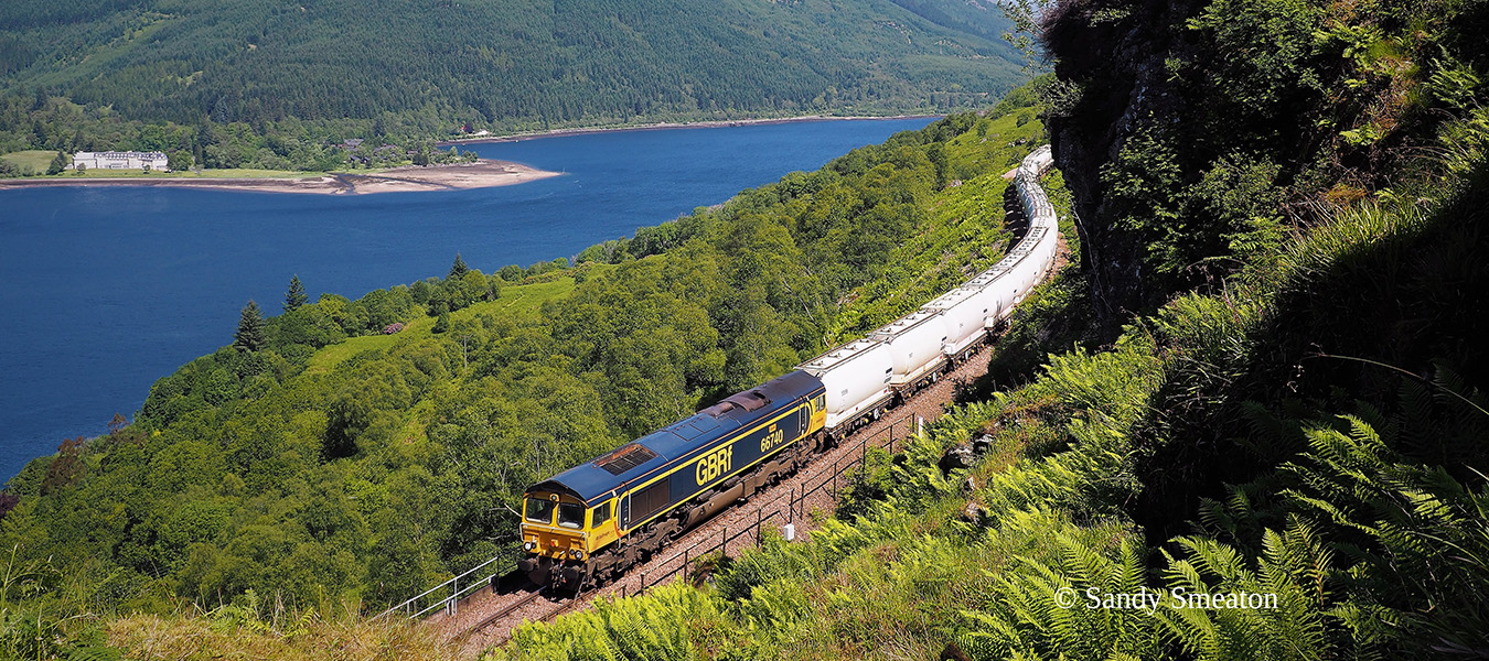 66740 ‘Sarah’ with 6E45 the empty Alcans about a mile from Glen Douglas Summit. Ben Narnain and A’Crois overlook.