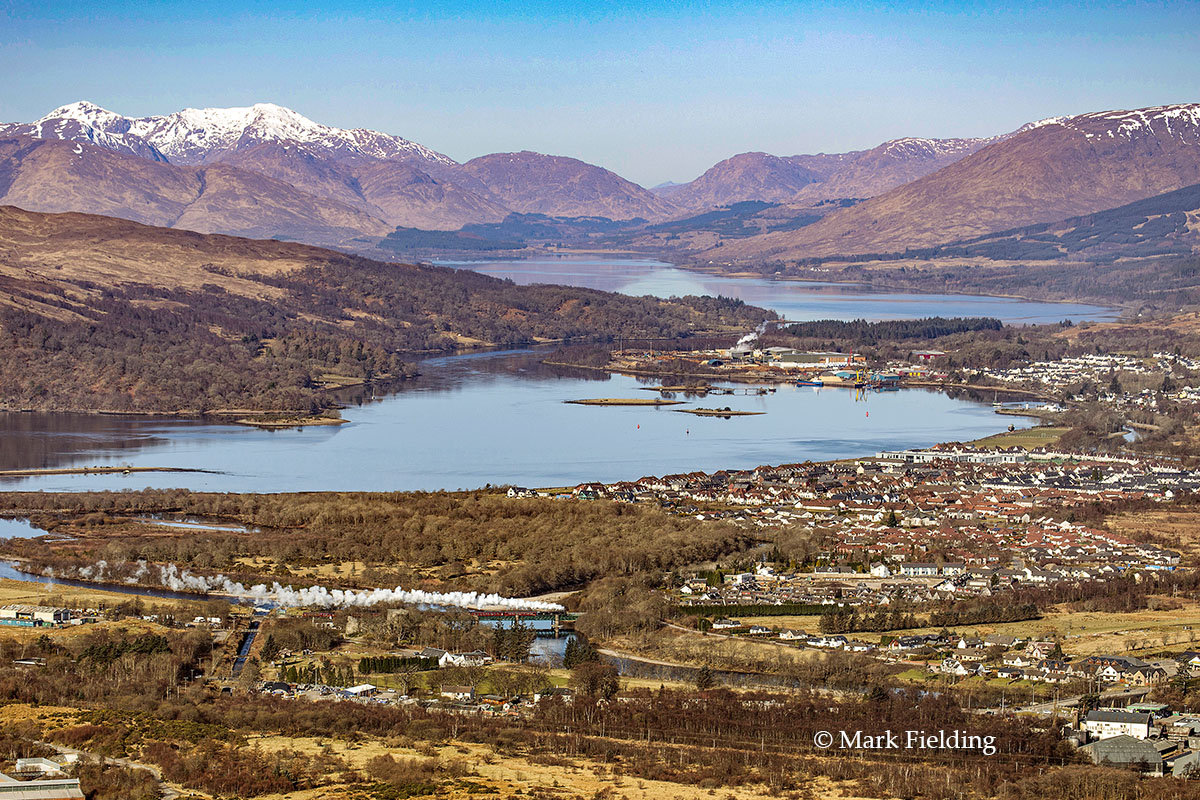 45417 The Glasgow Highlander (45407) departs Fort William over Lochy Bridge with The Jacobite on 1st April 2018.