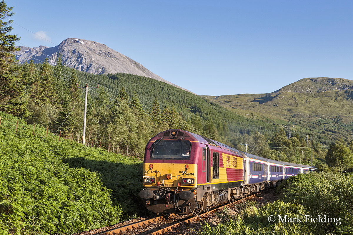67004 takes the Edinburgh to Fort William portion of the overnight Sleeper through Glen Spean on the morning of 8th July 2011.
