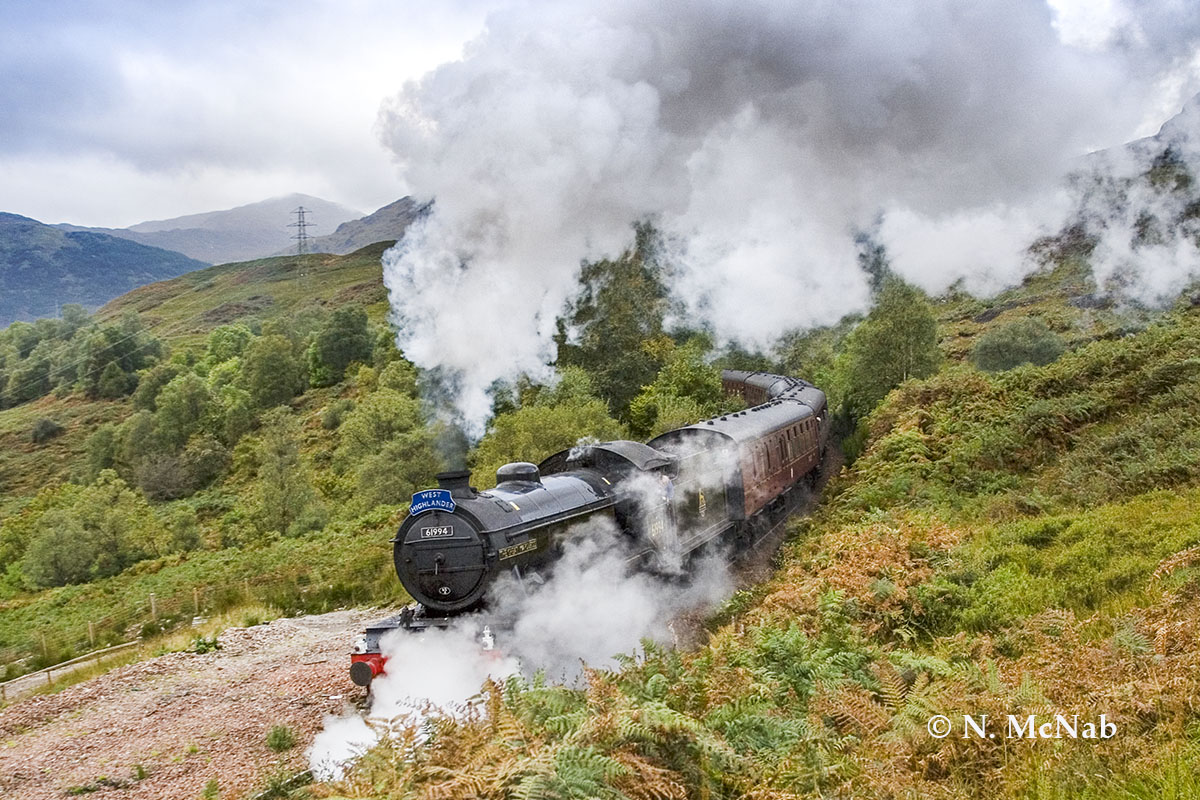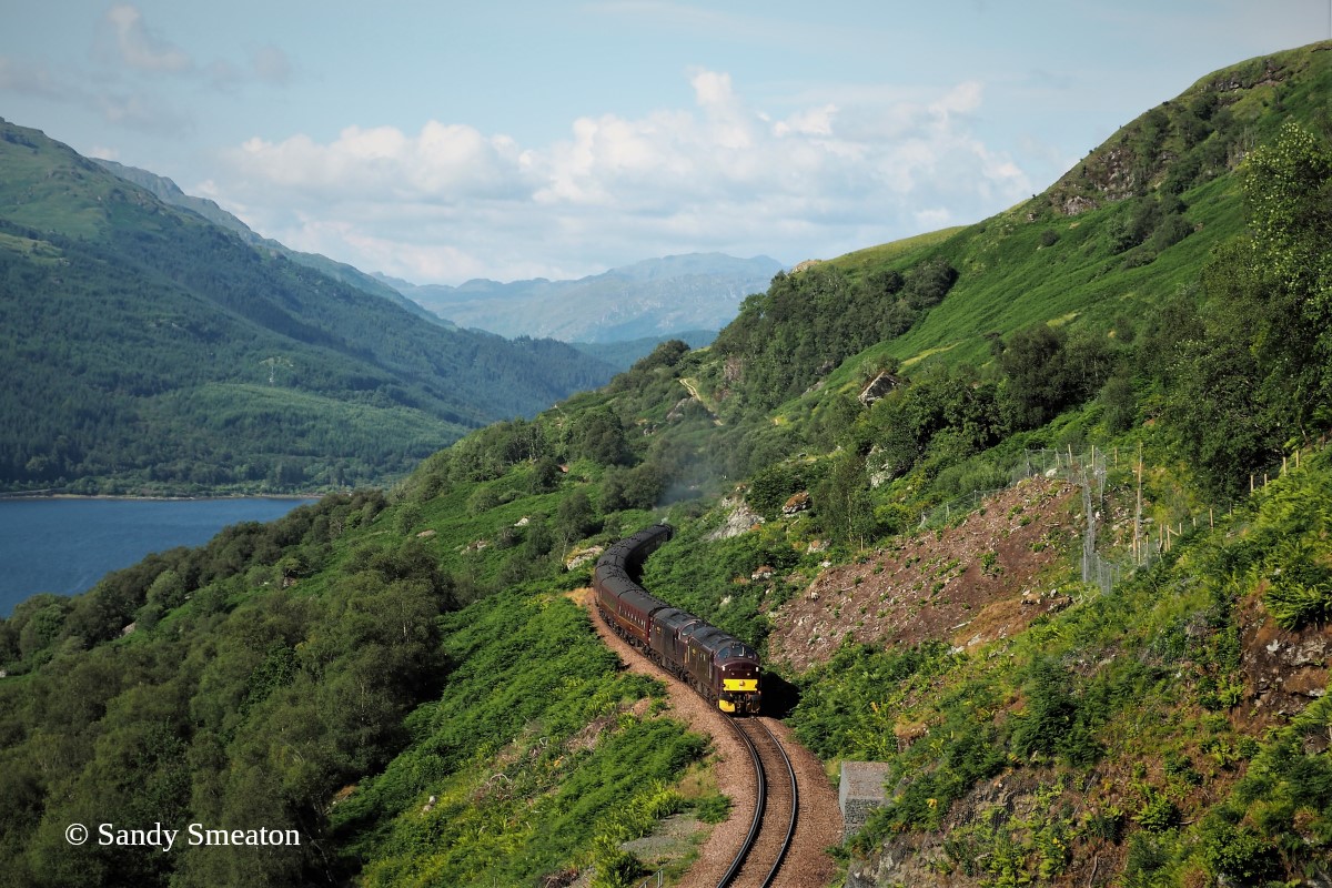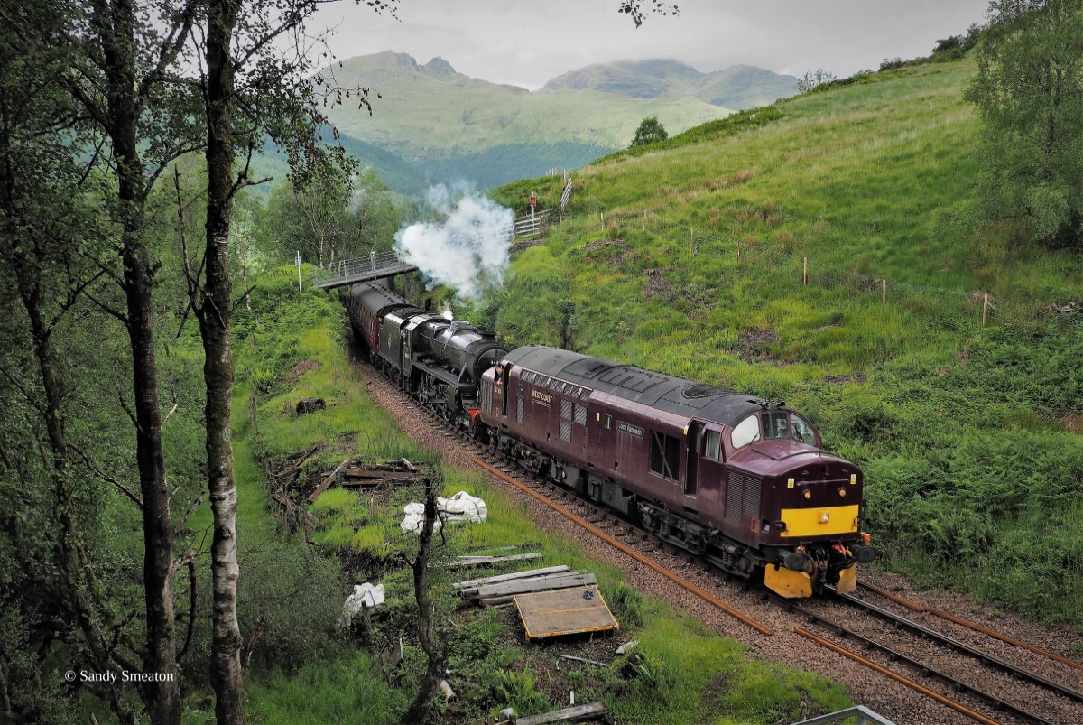 The Jacobite set and 44871 heading south at Glen Douglas for wheel turning with 37676 “Loch Rannoch”, June 2022.