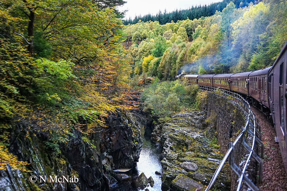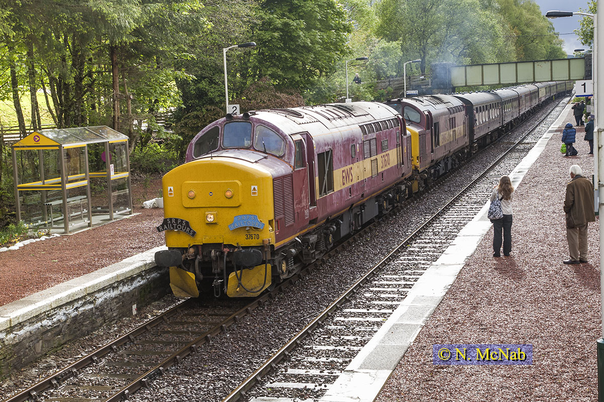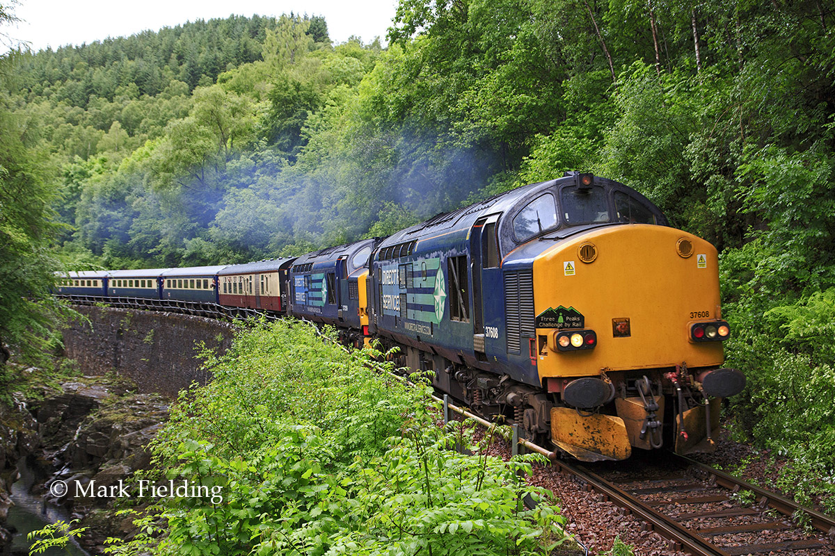 3 Peaks railtour, Monessie Gorge, returning to Euston after visiting Bangor, Ravenglass and Fort William. DRS 37608 and 37259, 22nd June 2013.